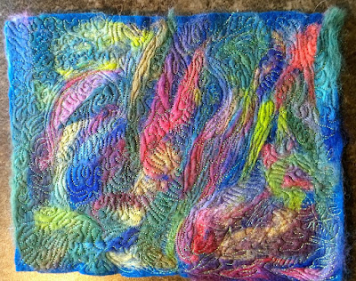 Both machines (embellisher and regular sewing machine) were in use yesterday. I used some of the roving purchased in Wolfville at Gaspereau Valley Fibres. Don't you just love the vibrant colours. I might have to go back for some more of the first colourway.